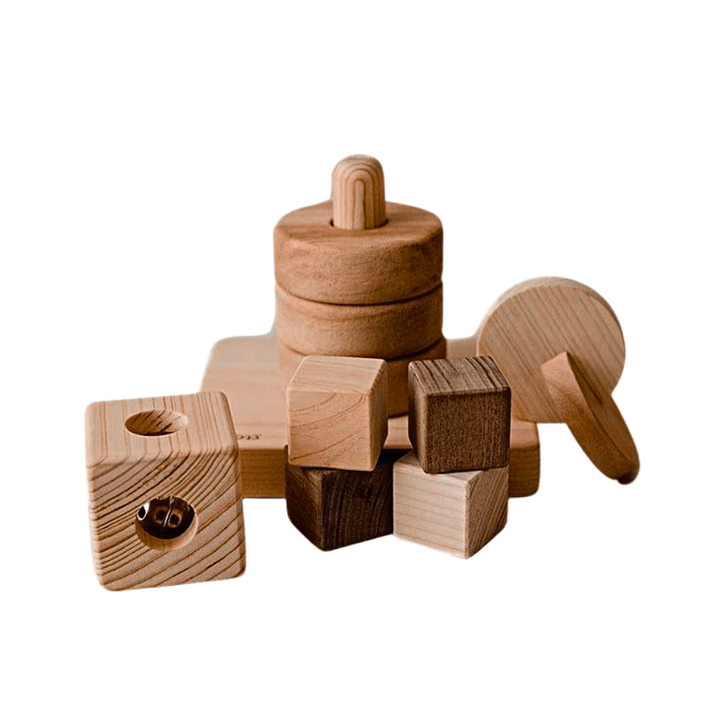 The perfect gift set for anyone welcoming a little one into the world. This set is made up of our Montesorri inspired toys. Includes: Dual Discs, Montessori Vertical ring stacker, Cube Rattle & 4 blocks