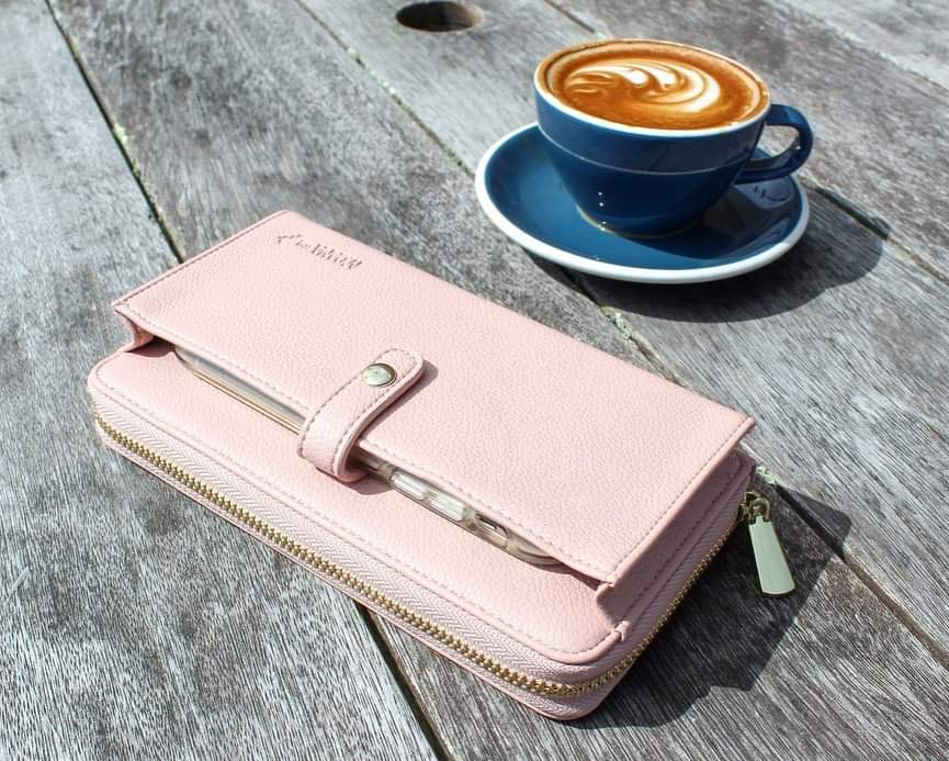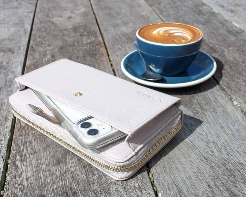 It has an external compartment for storing your smartphone, and internal zip compartments with space for 12 cards, a coin purse, and 4 large spaces for cash, receipts, and other bits and pieces.